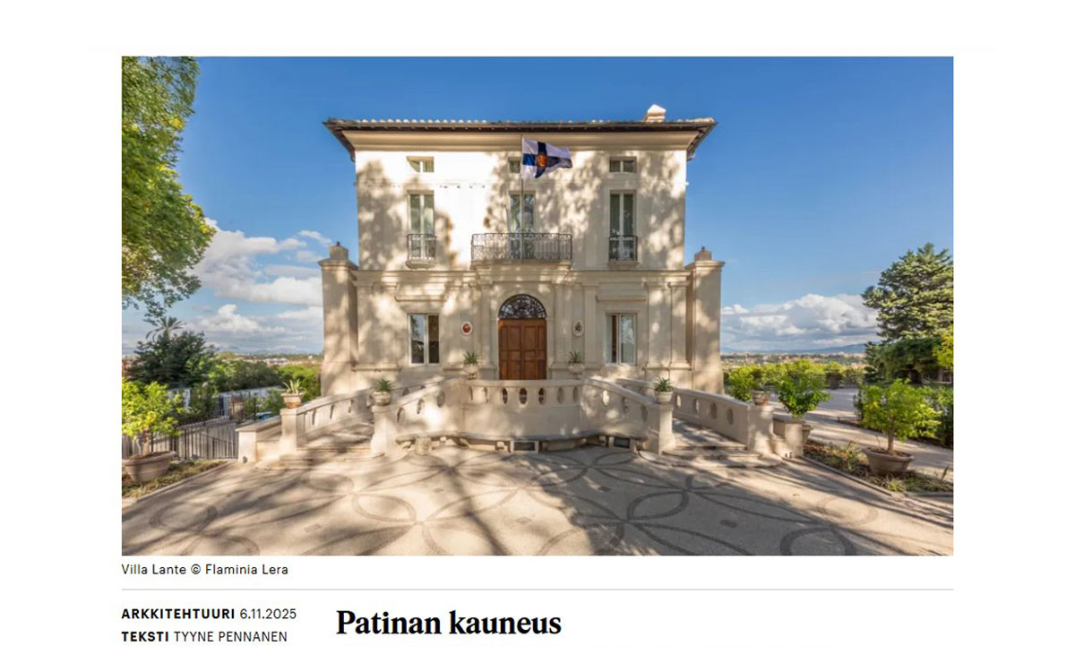 Lähes 2,5 vuotta kestänyt restaurointityö Roomassa on tullut päätökseen. Rooman Gianicolon kukkulalla sijaitseva Villa Lante on Suomen valtion omistama renesanssihuvila, vuodelta 1531. Villa Lantessa toimii Rooman Suomen instituutti, joka edistää antiikin ja Italian humanistisen perinnön tutkimusta sekä taiteita. KOKO3 vastasi Villa Lanten sisustusarkkitehtuurisista muutoksista. Arkkitehtuurimuutoksista vastasi ALA Arkkitehdit. Virallisia avajaisia vietetään Roomassa syyskuussa
